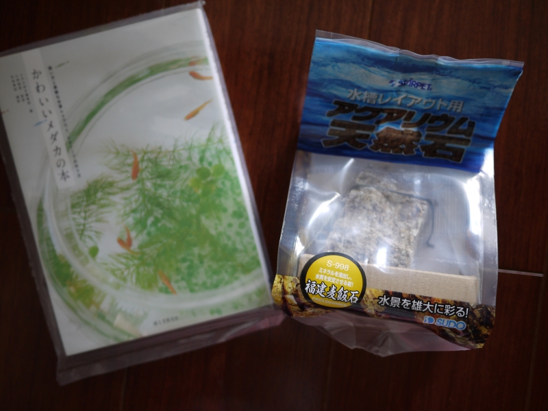 その他にはセンスがいいと評判のメダカ本と、でかい石、それとチャームさんオリジナルメダカ手ぬぐい。