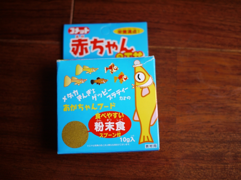 メダカたんもいろいろな種類のご飯があった方がよいということで、新しいメダカのエサ。稚魚用のも新しく。