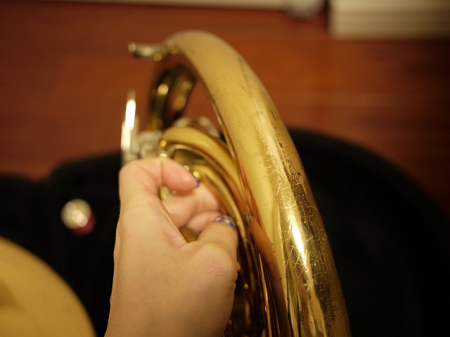 この楽器を修理している間に、同じ楽団の人にホルンを貸して頂いてたんだけど、その楽器がこの秋に買ったばかりのつるんつるん新品ホルン。