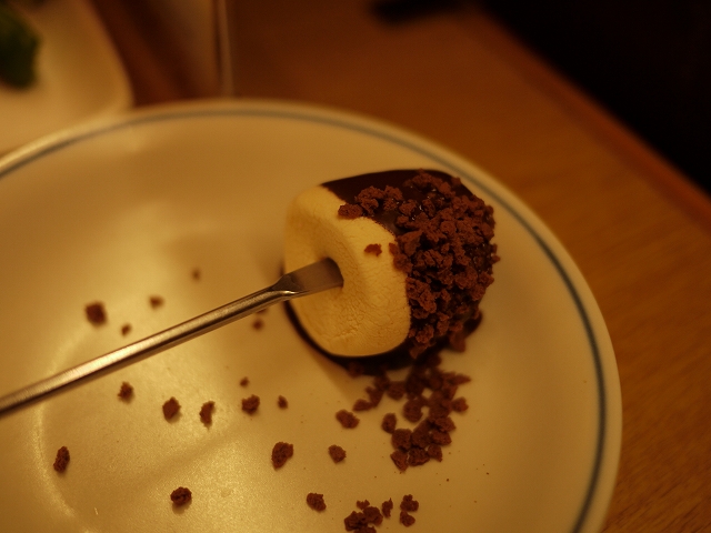 お約束のチョコファウンテンなるもの。マシュマロにつけてみた。