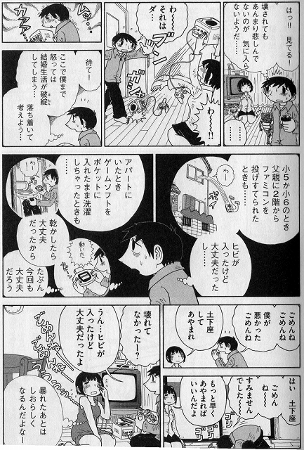 最近ネットでよく目にする画像・・泣いて怒ってる女が彼氏らきし人のの大事そうなものを選んで壊す(この場合はガンプラ・ゲームキューブ)画像・・ 「クソブタ!」と言いながら男を足蹴りしている画像・・自分の怒り方とそっくり加減がついに気になって漫画を買ってみまし た。それが福満しげゆきの「僕の小規模な生活」。