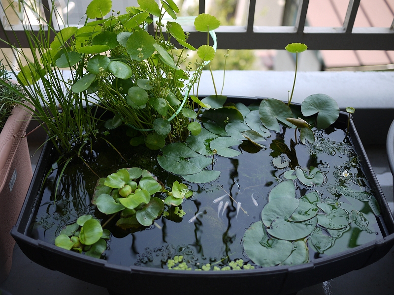 今時期は午前9時ぐらいから午後1時ぐらいまで直射日光が当たるベランダビオトープ。