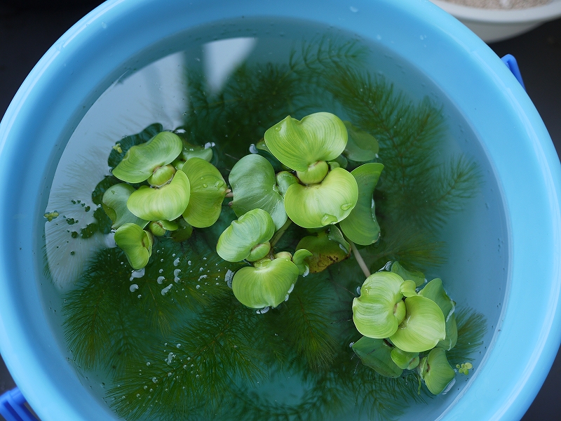 こちらは白&幹之ビオトープの増えすぎたマツモ&ホテイアオイを入れておくために買ってきたバケツ。何の気なしに見つけた白メダカの稚魚を入れていくうち、こちらでもまさかのヒラマキガイ稚貝を発見![]()