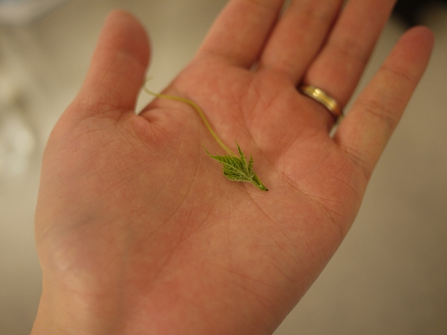摘心とは本つるの先っちょをぶっちぎること。これをやると横つるが増えて葉っぱがモサモサになるそーな。