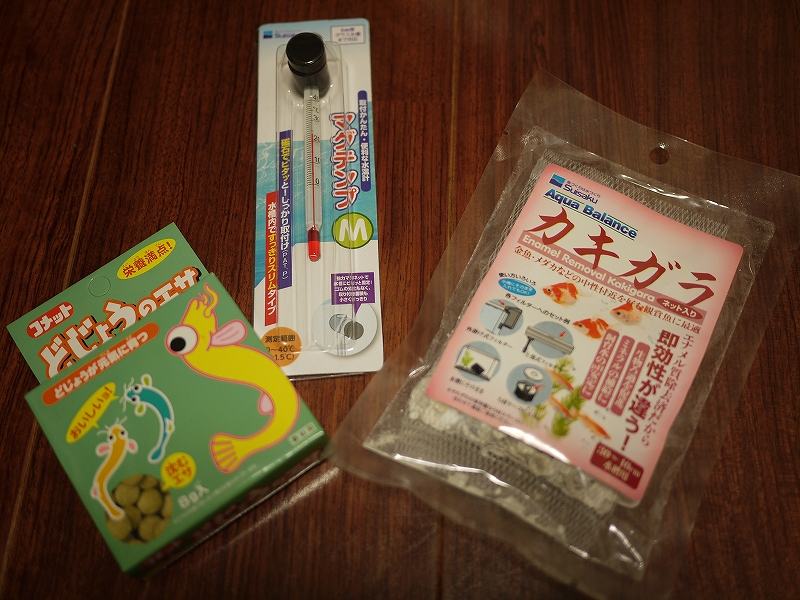 餌の足りない(かもしれない)タニシたんのためのドジョウのエサタブレットと、殻を強くしてほしいタニシたんのためのカキガラ、それと温度計。