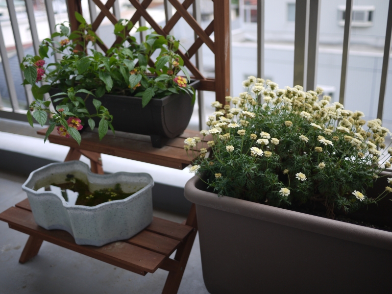 我慢ついでに、今まで室内にあった親メダカ3匹のおじゃが池をベランダに出してみた。