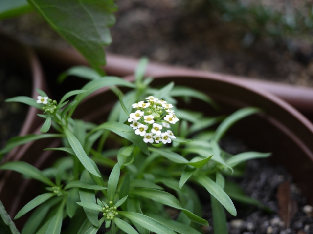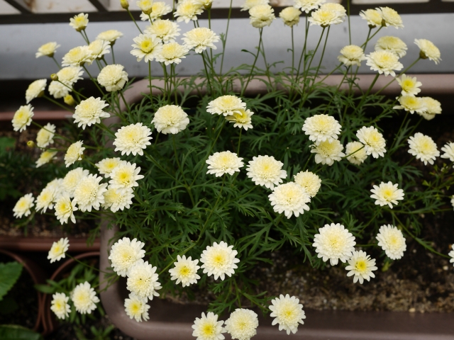 弱気で花が咲いてる苗から育てた八重咲きのボンザマーガレットと種から育てたアリッサム。