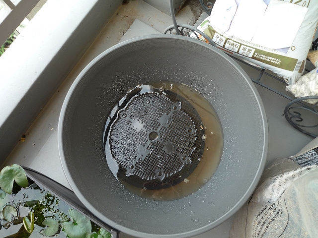 水入れたら噂通りの濁りようだったので、いつもは捨てる底部ネットを敷いて、