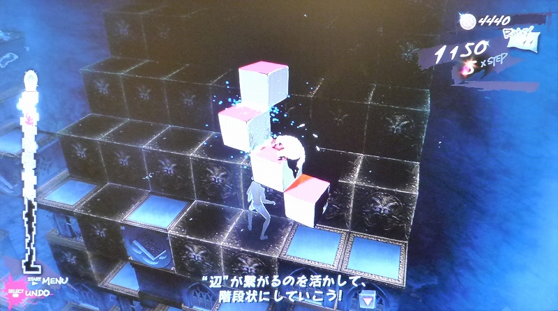 方向キーでヴィンセント(主人公のパンツ男)を動かすんだけど、進み過ぎたり動きが悪かったり、石の裏に回ると何やってるかわかんなかったりでやりづらい。