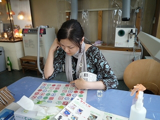 ↑色見本から選んで後ろの洗濯機のような機械で彫るなり。