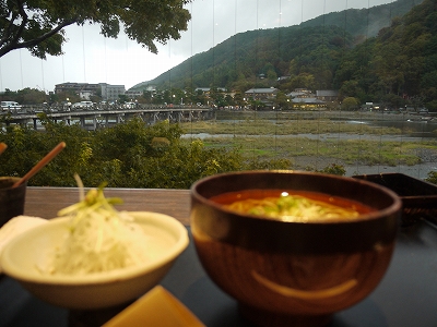人がいない時間帯だったから、窓側2階席で渡月橋を眺めながら。大雨だけど。