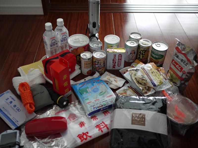 アルファ米、缶ビスケット、缶リッツ、おかゆ、おでん缶、スープ、5年水、サクマドロップ、カップお皿、ろうそく、飲料水袋、軍手、応急セット、マスク、薬、タオル、ブランケット、アルミブランケット、ゴミ袋、ロープ、ビニル紐、乾電池、簡易トイレ袋、懐中電灯、マルチパワーステーション(ライト、充電、ラジオ)、水でもどるタオル、笛、PSP。