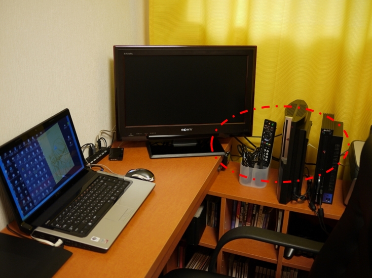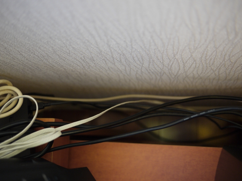 配線を机の上(テレビの後ろ)に上げただけ。一応縛ったりしたけど、余計熱が怖くなった気も。