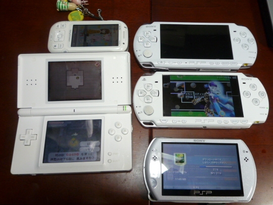 昔のwalkmanケータイと、DSlightとPSP3000とPSP2000と、今回新しく来たPSP goさん。
