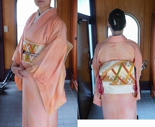 ピンクと黄色のぼかし着物。青海波の地紋入り。