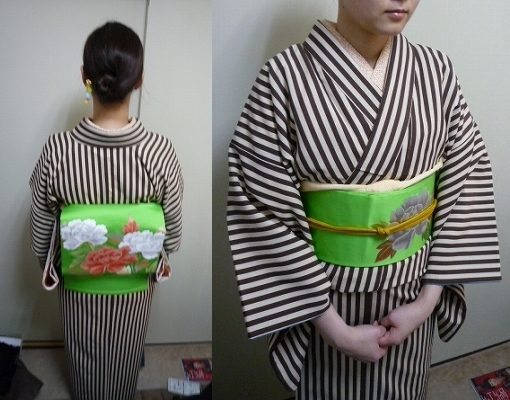 ネットであつらえた縞の着物に、オークションで落札したまっ黄緑の牡丹の帯。