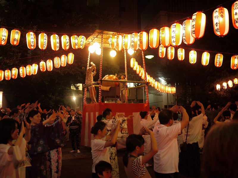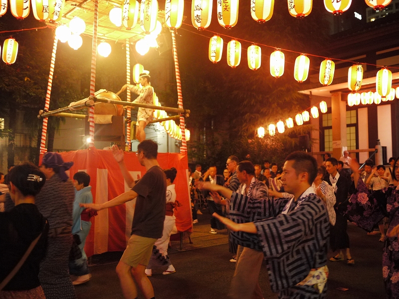 浴衣の人がいっぱいいて、櫓太鼓の周りで盆踊り。